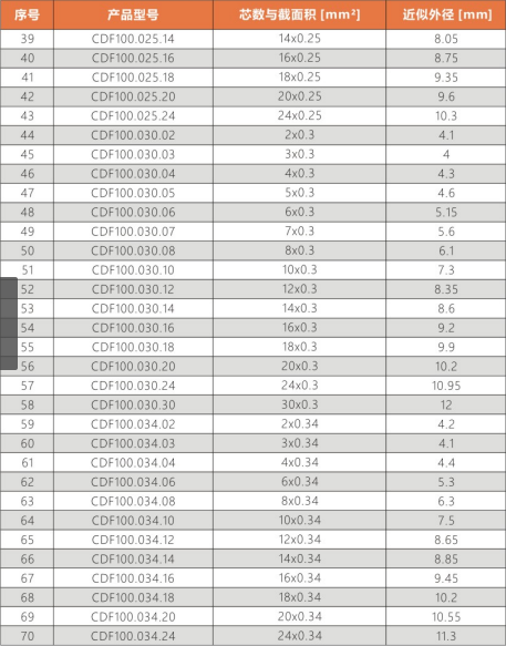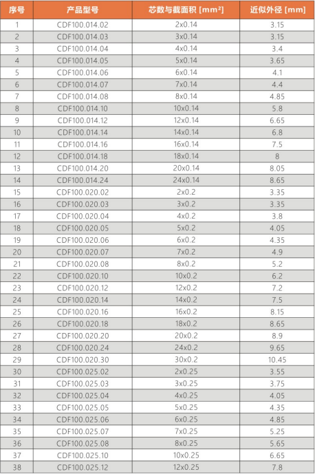 CDF100系列:適合于高速運(yùn)動(dòng),標(biāo)準(zhǔn)彎曲半徑拖鏈中使用。耐磨/耐彎曲/阻燃/環(huán)保/抗撕裂等性能優(yōu)異,耐油類附著。常用于:3C,醫(yī)療,新能源,航天,軍工裝備等行業(yè)拖鏈系統(tǒng)的信號(hào)傳輸。